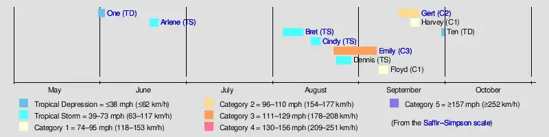 The 1993 Atlantic hurricane season consisted of the events that occurred in the annual cycle of tropical cyclone formation over the Atlantic Ocean north of the Equator. The official bounds of each Atlantic hurricane season are dates that conventionally delineate the period each year during which tropical cyclones tend to form in the basin according to the National Hurricane Center, beginning on June 1 and ending on November 30.[1] However, tropical cyclogenesis is possible at any time of the year, as evidenced by the development of Tropical Depression One on May 31,[2] one day before the official start of the season. By contrast, the dissipation of Tropical Depression Ten on September 30 effectively concluded the season two months before it officially ended.[1][3] September 21 was the final date on which a system of at least tropical storm strength was active; this was described in a 1995 retrospective from Monthly Weather Review as the earliest such occurrence since 1930.[nb 1][5]: 871 Seasonal activity was below average – of the season's 10 tropical depressions, eight strengthened further to become named tropical storms and four became hurricanes, compared to contemporary long-term averages of 10 tropical storms and six hurricanes, and modern averages of 14 tropical storms and seven hurricanes.[1][5]: 871 Hurricane Emily was the only Atlantic major hurricane in 1993;[nb 2] this is slightly below the contemporary average of two major hurricanes per season, while modern seasons produce three on average.[1][6]