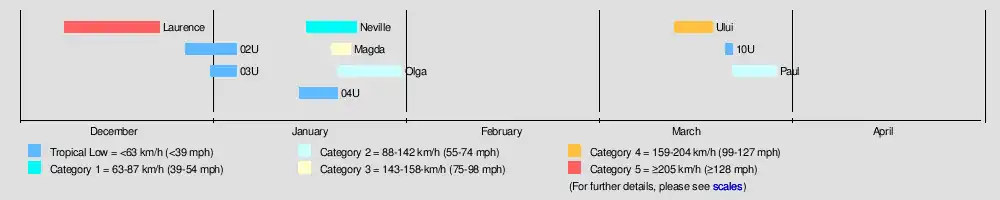 - 0000 UTC — TCWC Darwin reports that Tropical Low 01U has become a Category One Tropical Cyclone and is named as Cyclone Laurence.