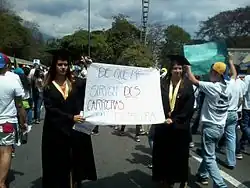 • 27 February – Students led by Juan Requesens protested against violence, detention and torture of students and the shortages in Venezuela, with Herique Capriles visiting, but not as a spokesperson.[106] The government issued an arrest warrant for Carlos Vecchio, a leader of Popular Will on various charges.[107] Medics in Maracay, Aragua state, protest against the condition of the hospitals in the state.[108] President Maduro decreed 27 February as "The Day of No Work in Venezuela" in respect for the fallen of the protests (that date was also the 25th anniversary of the historic Caracazo of 1989).[109]