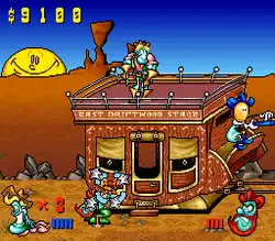 Cash is gained by shooting enemies, and lost by wasting bullets and damaging the town.[18] Cash is used to save progress,[19] and the balance determines the ending of the story.[11] There are objects to hit, such as canteens that regain Tin Star's hit points.[19] However, if the canteen is hit in a stage, the bonus stage afterward is disabled. In the bonus stage, cash is obtained by shooting stars that surround a woman on a spinning disk.[12]