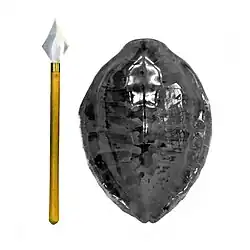 The term Tinbe-Rochin refers to an arms and armor combination of a short spear (rochin, ローチン) and a shield (tinbe or tinbei, ティンベー). It is one of the least well-known Okinawan weapon systems. The tinbe can be made of various materials but is commonly found in vine, cane, metal, or turtle shell. The shield size is generally about 45 cm long and 38 cm wide . The length of the rochin is usually equivalent to the length of the forearm and can be found in many differing designs varying from spears to short swords and machete-style (seiryuto) implements. In use, the techniques tend to be circular in order to avoid excessive contact with the shield . The short spear is predominantly used in an upward stabbing motion, piercing armor under the rib cage, armpits, and throat although dependent upon the type of Rochin used, slashing motions can also be employed. [1]