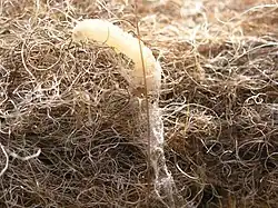 The range of recorded foodstuffs includes linen, silk and wool fabrics as well as furs. They will eat synthetic and cotton fibers if they are blended with wool and may use some cotton to build their cocoon.[13] Furthermore, they have been found on shed feathers and hair, bran, semolina and flour (possibly preferring wheat flour), biscuits, casein, and insect specimens in museums. In one case, living T. bisselliella caterpillars were found in salt. They had probably accidentally wandered there, as even to such a polyphagous species as this one pure sodium chloride has no nutritional value and is in fact a strong desiccant, but this still attests to their robustness.[15] Unfavorable temperature and humidity can slow development, but will not always stop it.