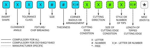 Inserts used for turning and milling are often numbered according to ISO standard 1832. This standard aims to make the naming, specifying and ordering of inserts a simple, consistent and traceable process. This standard takes into account both metric and imperial systems of units, although certain elements differ for each unit system. The code consists of up to 13 symbols with the first 12 of them being compulsory for inserts composed of cubic boron or poly-crystalline diamond and the first 7 being compulsory for all other types of composition.[2]