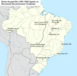 The movement was a precursor of left-wing armed struggle in Brazil[82] and one of the first attempts to start a rural guerrilla, an ambition that would only be effectively implemented with the Araguaia Guerrilla[83] and was already dreamed of by its future realizers, the PCdoB board of directors, in the founding of the party in 1962.[f] The Peasant Leagues were also pioneers in sending militants to train in Cuba.[84] The MRT evidences that the armed struggle, considered a response to the 1964 coup d'état and the hardening of the military dictatorship with Institutional Act No. 5, was already considered by a part of the Brazilian left before these events.[g] In this sense, it is comparable to the Tupamaros in Uruguay, who started their activities when the country was still democratic.[85]