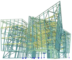 The structural design of the Titanic Belfast building was a complex engineering challenge due to its innovative architecture, including an "inverted" steel frame structure where floor sizes increase with height. The superstructure, composed of a steel frame with composite concrete beams and floors, required careful consideration of stability, especially with the large, unrestrained heights. MasterSeries was utilized in the design of the steel structure, enabling the engineers to model and analyze the unique frame stability issues, particularly where custom steel columns were necessary due to the aesthetic and spatial demands. The building's structural integrity was further enhanced by the integration of slip-form reinforced concrete staircases, which contributed to overall stability.[22]