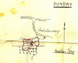 Part of an 1842 tithe map including the small village of East Dundry near Bristol, England, with names of its fields and two farms. Note the tithe-officer signature and stamp near the top.