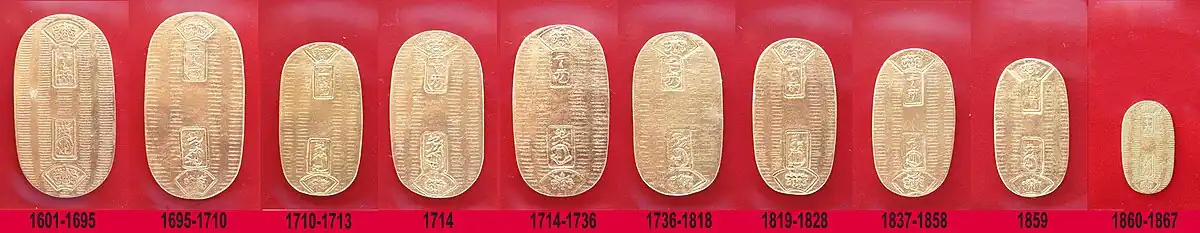 The establishment of Tokugawa coinage followed a period in which Japan was dependent on Chinese bronze coins for its currency.[2] Tokugawa coinage lasted for more than two centuries, and ended with the events of the Boshin war and the establishment of the Meiji restoration. However, there is an ongoing discussion of the entity of the precious metal coins. It was not a part of Tokugawa bakufu which issued gold and silver coins, but private organizations owned by merchants.[3]