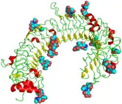 The structure of TLR3 was reported in June 2005 by researchers at The Scripps Research Institute.[14] TLR3 forms a large horseshoe shape that contacts with a neighboring horseshoe, forming a "dimer" of two horseshoes. Much of the TLR3 protein surface is covered with sugar molecules, making it a glycoprotein, but on one face (including the proposed interface between the two horseshoes), there is a large sugar-free surface. This surface also contains two distinct patches rich in positively charged amino acids, which may be a binding site for negatively charged double-stranded RNA.