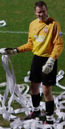He was released by Scunthorpe in May 2006 and joined Conference National club York City on 31 July after making a good impression on manager Billy McEwan during several weeks on trial.[6][7] He said that he believed promotion could be achieved for York with 20 clean sheets.[8] He was sent off in the 16th minute of an away match against Crawley Town on 9 September 2006 after fouling Dannie Bulman outside the penalty area, which York lost 3–0 with second choice goalkeeper Arran Reid brought on to replace him.[9] He was offered a new contract by York at the end of 2006–07.[10]