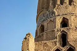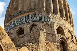 Originally built as a khanqah with a vaulted iwan and two domed mausoleums,[9] the surviving parts of the building consist of a pishtaq iwan flanked by the tomb of Tughay on one side and a chamber on the other, which was originally domed. Some remains indicate that one of the façades of the khanqah had a row of vaulted cells - these were living units for the Sufis.[7] The minaret, located at the main entrance, was destroyed. There was a waterwheel on the site.