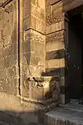 The mihrab consists of two pointed arches and its conche and spandrels are made of stucco with some remaining decoration. A feature worth noting is the bosses that were originally on the spandrels, in Ilkhanid style, similar to those of the no longer extant Qasr al-Ablaq (712 AH / 1313-14 CE), suggesting they were made by a Tabrizi workshop in Cairo.[12] There is a band along the spandrels with arabesque motifs. The decorations would have been painted. There is a rectangular niche to either side of the mihrab.