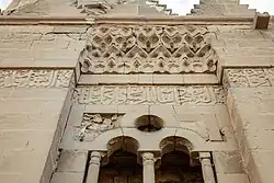 In the iwan, three stucco medallions decorate the walls. The central one is above the mihrab (instead of the oculus that was so common in Cairo mosques) and the other two are centered in the width of the right and left walls. They have inscriptions, arabesques and 6 bosses with a floral pattern (the text is currently only readable on the south and north medallions). Their design resembles contemporary metal work and there are only three other contemporary examples of such features in medallions in Mamluk architecture in Cairo.[5] The bosses with floral patterns and the high relief borders also highlight the uniqueness of this building. There are two blind windows to either side of the central medallion and both have foliated decoration in their grills.