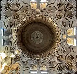 The dome, in a cylindrical shape curving at the top,[11] is made of brick masonry. Its exterior shape has 32 ribs and 24 niches in the drum.[1] The ribs are the earliest variation on the simple, plain dome, and may be seen in the Fatimid mausoleums in Cairo, as in the Mashhad of Sayyida Ruqayya (528 AH / 1133 CE). The earliest example of a Mamluk dome with 32 ribs is the Tomb of al-Sawabi (684 AH / 1285 CE).