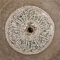 The inscription bands in the exterior and interior base of the dome have the same text - Sura 2, Aya 255 (the Throne Verse).[13] The one on the interior has a foliated border with a foliated background and one lotus flower, the latter a feature that shows the growing Chinese influence on Cairene art and architectural decoration.[11] The inscription on the exterior of the dome is in tile mosaic with a blue background and white letters. It is a bit unusual, since it is one of only 13 documented Mamluk monuments with a tile mosaic.[5] This band also has cartouches with knots and a 6-pointed star in the center.
