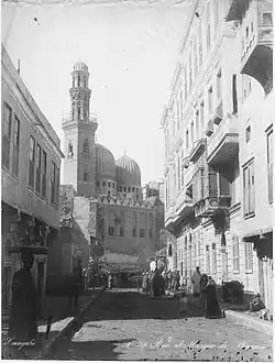 The minaret, made of stone,[1] is a significant piece in the evolution of minarets in medieval Cairo.[3] It partly resembles the earlier minaret of Sultan Qalawun's mausoleum at Bayn al-Qasrayn[1] but some of its details, such as its more slender proportions and its lantern-like summit, presage the developments of later minarets.[3] One unusual feature of the minaret, found elsewhere only in the Mosque of Emir Bashtak (1340), is a marked entrance portal at the bottom of its shaft, where one accesses the interior staircase that climbs to the top. The portal here has a trilobed arch shape and includes two side benches.[1]