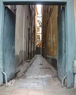 Torgdragargränd (Swedish: "Market Draughter's Alley") is an alley in Gamla stan, the old town in Stockholm, Sweden. Stretching from the street Västerlånggatan to the square Kornhamnstorg, it forms a parallel street to Tyska Brinken and Funckens Gränd. Prior to 1981, Torgdragargränd was closed with a gate at Kornhamstorg and a low building at the other end. The present name commemorates the people working at the market next to the alley.[1]