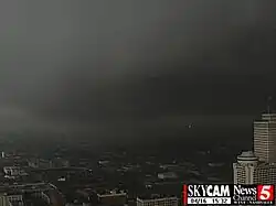 ![]() Screen shot of WTVF's Skycam as the F3 tornado passed through downtown Nashville. | |
