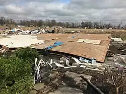 | Two metal buildings had most of their roofs removed and all their garage bay doors blown out. The buildings' exterior walls were partially removed. Several buses inside sustained significant damage from debris. Building material was pulverized and embedded in the ground and walls of buildings downwind. A nearby metal building also sustained roof damage. A few large hardwood trees were also uprooted.[27] | |||||||