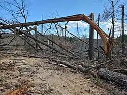 The tornado then crossed the White River into Izard County, downing several more trees along the river and near Boswell were uprooted at low-end EF2 intensity. The tornado passed through the south of the community of Boswell before moving through areas just north of Jumbo. Hundreds of trees were snapped and downing power lines, and causing additional structural damage.[50] The tornado maintained low-end EF2 intensity south of Knob Creek, Numerous large hardwood trees were blown down as the tornado continued to track east-northeastward through mainly rural areas, crossing La Crosse Road between Violet Hill and Larkin.[51][52][53]
