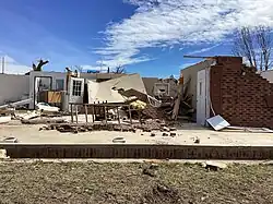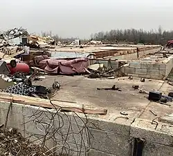 The tornado continued east-northeastward at EF2 intensity, leveling an old milk barn along Route FF with only the roof structure being left intact. Numerous trees nearby were uprooted in a cyclonic pattern and another outbuilding suffered roof damaged.[38] The tornado destroyed another cinder block foundation mobile home along County Road 6810 before weakening to EF0 intensity as it crossed Route E, causing only minor to moderate tree damage as it continued east-northeastward. The tornado regained EF1 intensity to the west of China, where several roof decks were ripped off of homes along County Road 6450, with moderate tree damage noted.[38] Multiple outbuildings along Route JJ were severely damaged, another home had roof damage and its roof deck removed, and several trees were uprooted.[38] The tornado briefly intensified to mid-range EF2 intensity after crossing Route 17 near Cottbus. A two-story brick home was significantly damaged, with portions of the roof removed and parts of the paneling walls collapsing. Another home nearby had most of its roof deck removed and an outbuilding was destroyed.[38] The tornado then struck Frankville at EF1 intensity, inflicting heavy roof damage to a warehouse along US 63.[38] The last area of damage that was found from this tornado occurred along US 160 east of West Plains, where trees were uprooted at EF0 intensity. The tornado then dissipated as it crossed the highway at 9:16 p.m. CDT.[38] The tornado traveled 35.74 miles (57.52 km) and reached a maximum width of 1,200 yards (1,100 m) during its 42-minute lifespan, causing three fatalities and four reported injuries.[12][38][44] After the tornado, FEMA set up a relief shelter at the Bakersfield School.[41]