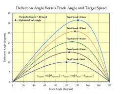 A number of publications[46][47] state the optimum torpedo track angle as 110° for a Mk 14 (46 knot weapon). Figure 4 shows a plot of the deflection angle versus track angle when the gyro angle is 0° (i.e.., θDeflection=θBearing).[48] Optimum track angle is defined as the point of minimum deflection angle sensitivity to track angle errors for a given target speed. This minimum occurs at the points of zero slope on the curves in Figure 4 (these points are marked by small triangles).