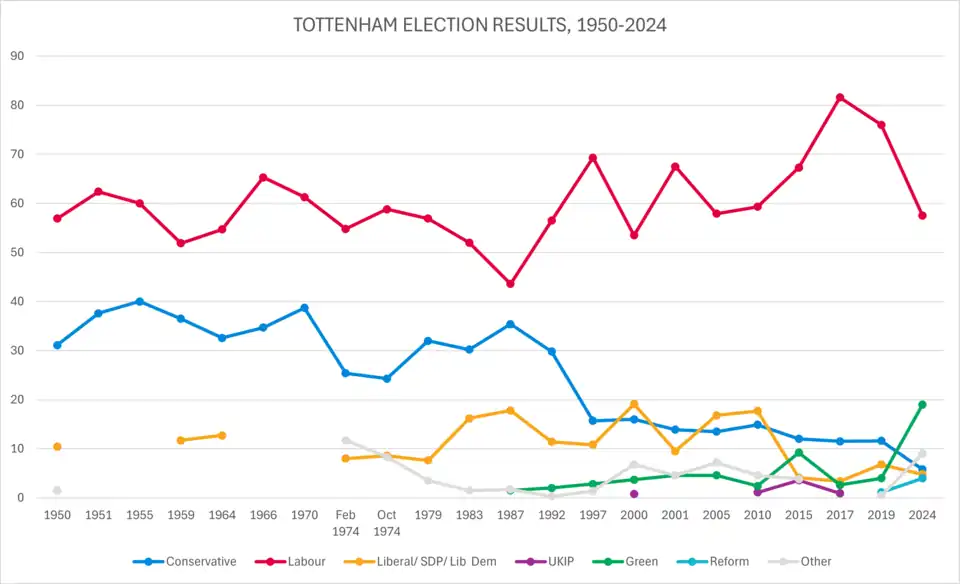 A cosmopolitan, inner-city seat in the London Borough of Haringey, Tottenham has a large ethnic minority population – around one-fifth of the residents are Black, and there is a large Muslim population. Excluding the south of the constituency, the percentage of White residents understates the ethnic variety of this constituency, similar to the borough as a whole[10] which includes major Cypriot, Irish, Eastern European, Jewish and Russian communities. The seat includes the two Haringey metropolitan centres[11] of Harringay and Tottenham. London football club Tottenham Hotspur F.C. is also based in the constituency.
