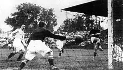 Bologna managed to score a third before the break, again via Reguzzoni.[2] In the second half, Bologna relaxed due their three-goal advantage, and the English took advantage of this to take control of the game, but they failed to find a goal because of the great Bologna defence, which included the unbeatable Carlo Ceresoli between the posts, the physical strength and class of Dino Fiorini and the positional sense of Felice Gasperi.[3] Reguzzoni sealed his hat-trick in the 65th minute with a goal against the run of play, and thus gave Bologna a resounding 4–0 lead. Chelsea was able to salvage a small measure of honour with a fine solo move by Sam Weaver.[2] The best Bologna players were Ceresoli, Reguzzoni, Sansone and Andreolo and Fedullo, all of whom were South Americans.[2]