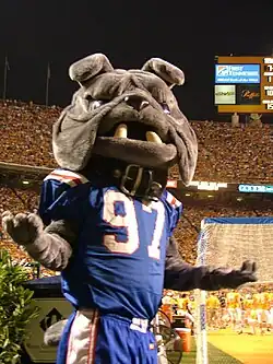 Some might say it's a coincidence that the two biggest wins in the program's Division I-A history had been decided in the south end zone under the watchful eyes of the Spirit of '88. However, the third time proved it was more than just chance. On a warm October 2 evening in 2004, Louisiana Tech found itself trailing No. 17 ranked Fresno State 21-20 late in the fourth quarter. Fresno State had the football and the momentum, trying to move out of its own end zone—the south end zone—against a Tech defense and its 12th man, or should we say Dawg. However, under the watchful eyes of the Spirit of '88, the Tech defense and offense would both strike. On third down Fresno State quarterback Paul Pinegar was intercepted by Byron Santiago who returned the football down to the 16-yard line. Two plays later, Ryan Moats gave Tech a 28–21 lead and the eventual win as he rushed eight yards to the right corner of the south end zone. The Bulldogs had defeated the 17th-ranked team in the nation. A Joe Aillet Stadium crowd celebrated wildly with the Tech players, coaches and the Spirit of '88. Some may say the powers of that bronze Bulldog are a fluke. Tech fans won't agree. The numbers say 59 wins and just 20 losses since the Spirit of '88 was unveiled. So fluke or not, the Bulldogs will continue to touch it each home game and hope the wins continue.[9]