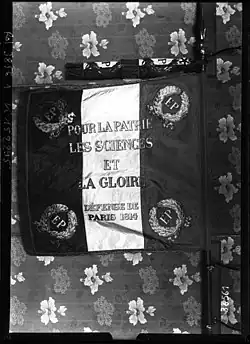 The battalion of the École Polytechnique received its flag during the distribution of the eagles at the Champ-de-Mars on December 5, 1804.[27] Tradition claims it was presented to François Arago by Napoleon. The school's motto, “For the Homeland, Science, and Glory,”[28] was embroidered on this flag. Since the Battle of Paris (March 31, 1814), the flag has borne the sole battle honor: "Defense of Paris, 1814." After Louis XVIII had restored the white flag of the Monarchy by the ordinance of May 12, 1814, the students burned their flag in the school's courtyard.[N 1] On March 23, 1901, in the school's courtyard, the second flag of the École Polytechnique was presented to Marcel Louis Jean Japiot (1879-1961), top of his class, by President Émile Loubet, accompanied by General André, Minister of War.[29][30]