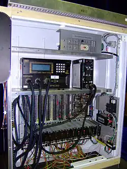 A traffic signal is typically controlled by a controller mounted inside a cabinet.[11] Some electro-mechanical controllers are still in use (New York City still had 4,800 as of 1998, though the number is lower now due to the prevalence of the signal controller boxes[12]). However, modern traffic controllers are solid state. The cabinet typically contains a power panel, to distribute electrical power in the cabinet; a detector interface panel, to connect to loop detectors and other detectors; detector amplifiers; the controller itself; a conflict monitor unit; flash transfer relays; a police panel, to allow the police to disable the signal; and other components.[11]