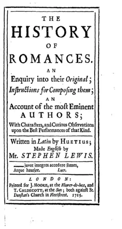- THE| HISTORY| OF| ROMANCES.| AN| Enquiry into their Original| Instructions for Composing them;| AN| Account of the most Eminent| AUTHORS;| With Characters, and Curious Observations| upon the Best Performances of that Kind.| [rule]| Written in Latin by HUETIUS;| Made English by STEPHEN LEWIS.| [rule]| —juvat integros accedere fontes,| Atque haurire. Lucr.| [rule]| LONDON:| Printed for J. HOOKE, at the Flower-de-luce, and| T. CALDECOTT, at the Sun; both against St.| Dunstan's Church in Fleetstreet. 1715.