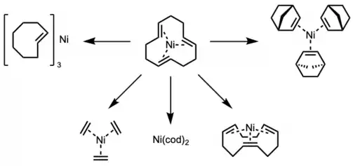 The all-trans-(cdt) ligand has been shown to be easily displaced with olefins such as trans-cyclooctene,[3] ethylene,[6] all-cis-(cdt),[7] norbornene,[6][8] to give the corresponding colorless 16-electron Ni(0)-olefin complexes with coplanar geometry. Ni(cod)2 can also be easily prepared from Ni(cdt).