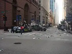 The scenes in Chicago were mostly shot on location, as Bay believed the plates had to really be shot in the real city. Farrar was always fascinated with the idea of shooting on location and then blending the film with computer-generated imagery. He said: "We try and shoot everything real. You may have seen some films recently where the entire city has been destroyed and it's entirely CGI. Well, for a Transformers film, it's different because we actually went to Chicago. If you start with the real thing, you have a lot more to work with to make it look real. So for a couple of months there, I was in a helicopter shooting aerial plates of the real buildings. And we'd add destruction to all the backgrounds – smoke, fire, debris, fighter planes, war, battles, torn up streets – to real cityscapes."[79] Four ILM employees also traveled to Chicago and photographed buildings from top to bottom at six different times of the day in order to create a digital model of the city to be used in certain scenes.[13] ILM's crew designed many major action scenes,[13] with many of the Chicago battle concepts coming from the helicopter shooting of the aerial plates.[75]