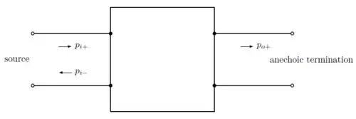 Note that cannot be measured directly in isolation from the reflected wave pressure (in the inlet, away from muffler). One has to resort to impedance tube technology or two-microphone method with modern instrumentation.[1] However at the downstream side of the muffler, in view of the anechoic termination, which ensures .