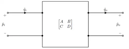 The low-frequency approximation implies that each subsystem is an acoustic two-port (or four-pole system) with two (and only two) unknown parameters, the complex amplitudes of two interfering waves travelling in opposite directions. Such a system can be described by its transmission matrix (or four-pole matrix), as follows[3]