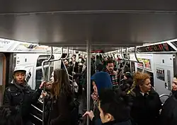 New York City is distinguished from other U.S. cities for its low personal automobile ownership and its significant use of public transportation. New York City has, by far, the highest rate of public transportation use of any American city, with 55.6% of workers who commute getting to work by this means in 2023.[6] About one in every three users of mass transit in the United States and two-thirds of the nation's rail riders live in New York City or its suburbs.[7] However, New York City also has the longest mean travel time for commuters (42.5 minutes) among major U.S. cities.[6]