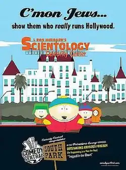 A few references have been made by the show and Comedy Central to Scientology as an aftermath of the controversy. On August 1, 2006, Comedy Central placed an advertisement in Variety showing the South Park stars against a background of L. Ron Hubbard's Scientology Celebrity Center, with the headline, "C'mon Jews, show them who really runs Hollywood."[60] Although often misunderstood by the public to parody the Mel Gibson DUI incident, the advertisement actually congratulates South Park on gaining an Emmy nomination for "Trapped in the Closet" and satirizes the cancellation of the episode's rebroadcast in March.[61][62]