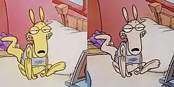 The differences between the original and Nickelodeon masters; left: the original masters display Rocko's yellow-ish color; right: the Nickelodeon masters toned down Rocko to beige-grey.