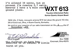 1980 QSL card confirming reception of TIS WXT613 located at the Cincinnati Airport
