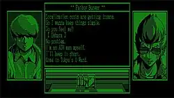 When originally announced, some took Suda's comments to reflect that the levels would be set within actual indie games like Hotline Miami, but Suda later clarified that these games would be featured as "T-shirt collaborations", with Travis able to unlock and wear clothing items that promote these indie games, a concept he came up with while seeing various game expositions like PAX West.[13] One such title is Hyper Light Drifter, with Nintendo of America showcasing Travis's shirt alongside announcing the game's release on the Switch.[14] Suda wanted players to see Travis as a fan of indie games, not only to give recognition to the indie game scene, but due to his belief that Grasshopper is similar to an indie developer, and he wanted to show his support of the up-and-coming smaller studios.[5] He estimated that there will be at least 15 indie games represented in Travis Strikes Again, with titles to be revealed as part of the ongoing promotion.[15] The game would also see the addition of t-shirts from The Legend of Zelda: Wind Waker,[16] The Legend of Zelda: Majora's Mask [17] and Zelda II: The Adventure of Link[18] that grant Travis a spin attack. The idea of crossing between games was partially influenced by the film Existenz.[6] UK artist Boneface contributed designs for the game's boss battles.[5]
