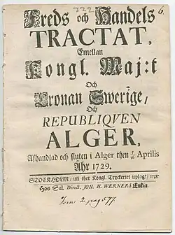 Treaty between Algiers and Sweden (1729) was the first treaty between Sweden and the Regency of Algiers[1] dealt with the treatment of Swedish captives in Algeria, and tribute payments in return for special passes for Swedish merchant ships that granted them immunity from attack in the Mediterranean Sea.[1]