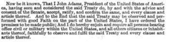 Now be it known, That I John Adams, President of the United States of America, having seen and considered the said Treaty do, by and with the advice and consent of the Senate, accept, ratify, and confirm the same, and every clause and article thereof. And to the End that the said Treaty may be observed, and performed with good Faith on the part of the United States, I have ordered the premises to be made public; And I do hereby enjoin and require all persons bearing office civil or military within the United States, and all other citizens or inhabitants thereof, faithfully to observe and fulfill the said Treaty and every clause and article thereof.