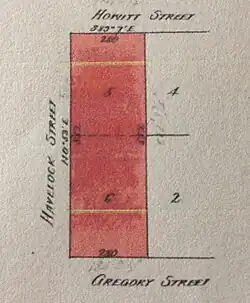 Beth Campbell's property from her mother's will was Allotment 6, the southern allotment or "top paddock",[68] bordered by the corner of Havelock and Gregory Streets, with a 260 feet frontage on Havelock Street, contained Trelawny and its outbuildings.[69]