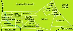 Its roughly rectangular shape, is oriented in the direction from northwest to southeast, is west of the Buenos Aires city, which separates the General Paz Avenue. On the north, it borders the General San Martin Partido separates Triunvirato Avenue, General Lavalle and ways of Ferrocarril General Urquiza. The records defined separation northeast with the Reconquista River, natural boundary with the San Miguel Partido. Meanwhile, to the south borders the partides of Morón, Hurlingham and La Matanza are separated by a number of streets and avenues.