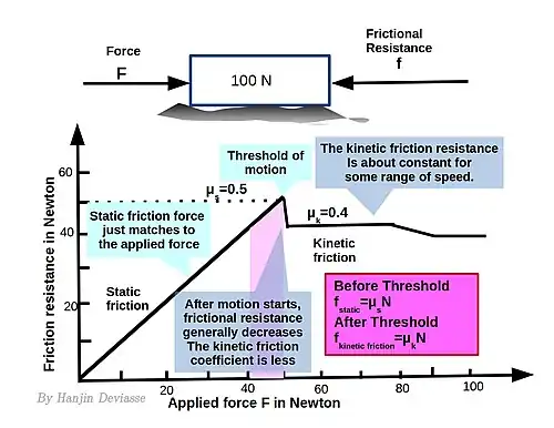 Although not universally applicable, these simple statements hold for a surprisingly wide range of systems.[4] These laws were further developed by Charles-Augustin de Coulomb (in 1785), who noticed that static friction force may depend on the contact time and sliding (kinetic) friction may depend on sliding velocity, normal force and contact area.[5][6]