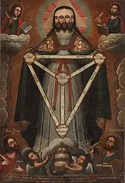 According to Henryk Lowmianski, the Triglav originated in Christianity – in the Middle Ages the Holy Trinity was depicted with three faces, which was later taken over by pagans in the form of a three-headed deity. However, this view cannot be accepted, since the depiction of the Holy Trinity with three faces is attested only from the 14th century, and the official condemnation by the Pope from 1628. The depiction of the Holy Trinity with three faces itself may be of pagan origin (Balkans).[28]