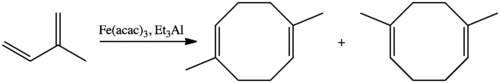 Fe(acac)3 has been examined as a precatalyst and reagent in organic chemistry, although the active iron-containing species is usually unidentified in these processes. In one instance, Fe(acac)3 was shown to promote cross-coupling a diene to an olefin.[5] Fe(acac)3 catalyzes the dimerization of isoprene to a mixture of 1,5-dimethyl-1,5-cyclooctadiene and 2,5-dimethyl-1,5-cyclooctadiene.[6]