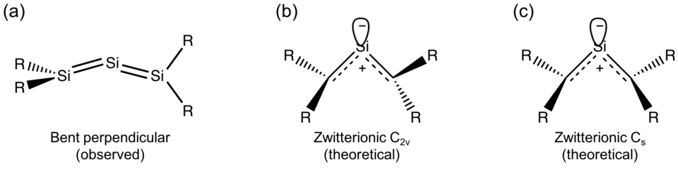 The ab initio and density functional theory (DFT) calculations predict that Si3R4 molecules with smaller substituents (R = H or Me) adopt zwitterionic structures with C2v or Cs symmetry and with drastically smaller bond angles (~70º for R = H, ~90º for R = Me).[1][2][7][8] However, the steric congestion required for isolation prevent these highly bent structures.[9]