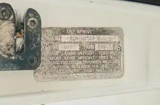 The factory produced TR7 Sprints have chassis numbers that are prefixed with letters ACH; whereas, UK/Australian/European specification TR7s of the time were prefixed ACG:[1][3] Figure 5 shows a chassis or commissioning plate from a TR7 Sprint car, mounted on the left-hand door, below the door lock. The TR7 Sprint engines are also prefixed with CH, rather than GC on the TR7's and VA on Dolomite Sprint engines; however, the TR7 Sprint engine numbers can, at least in some cases, be very hard to read (see Figure 6).