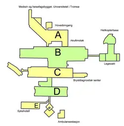 The heliport is situated on the premises of Tromsø University Hospital, situated north of the city center of Tromsø on the island of Tromsøya. The facility is owned and operated by the University Hospital of North Norway, part of Northern Norway Regional Health Authority.[7] The helipad is placed on top of the building complex used by the helicopter, along with a hangar. The helipad has a diameter of 33.6 meters (110 ft) and capable of handling helicopters up to 16 tonnes. From the helipad there is a skywalk across to the emergency department of the hospital.[8]